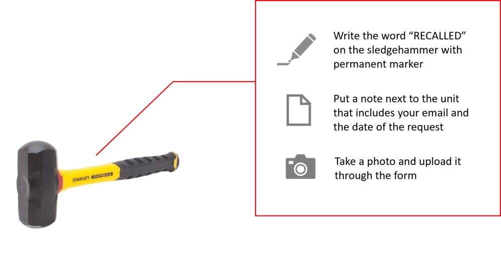 - Write “RECALLED” on your sledgehammer handle with a permanent marker, and put a note next to it where your email address and date of the request are visible. Take a picture and upload it using the form enabled below.